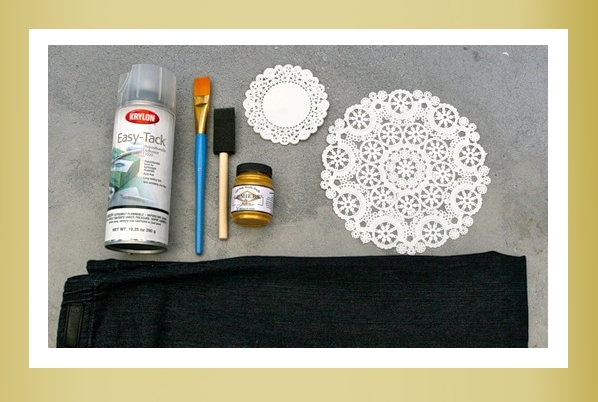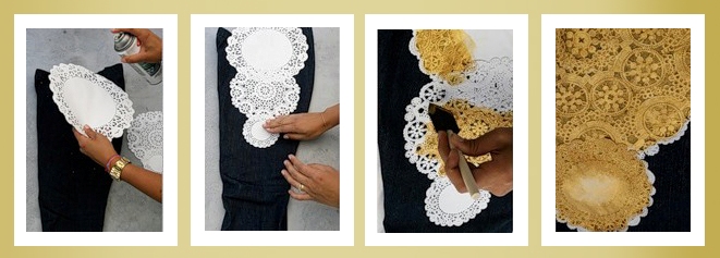 Для нанесения краски вам понадобится либо баллончик с акриловой краской, либо акриловая краска для ткани в банке. В том случае, если вы собираетесь пользоваться баллончиком, не забудьте прикрыть газетами ткань вокруг трафарета. Кружево лучше закрашивать из баллончика, тогда полупрозрачные части тоже закрасятся и будут иметь эффект матовости. А через салфетки лучше наносить краску с помощью поролоновой губки.