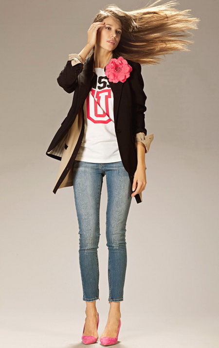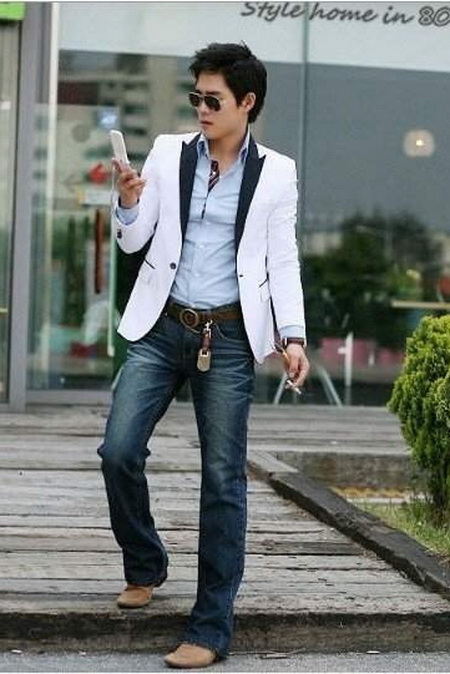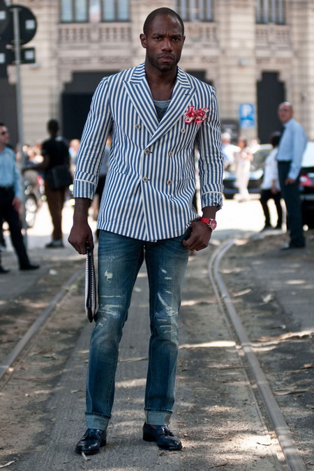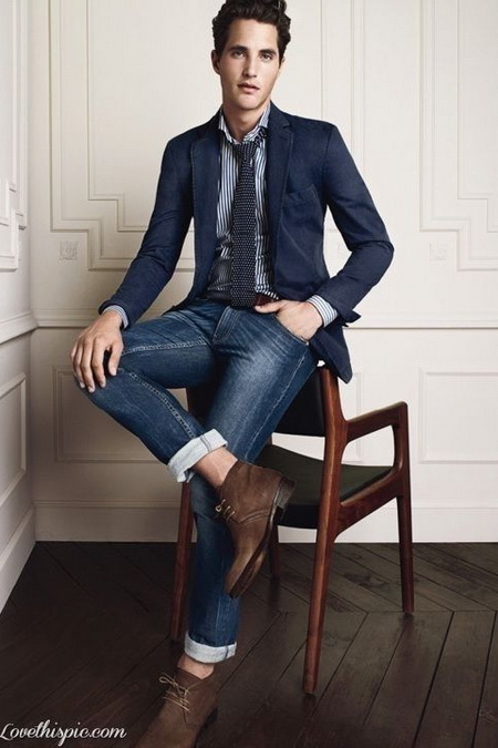 С пиджаками будут хорошо сочетаться зауженные к низу джинсы, в будущем такой наряд обещает быть хитом. Заострим ваше внимание: строго следовать букве моды, это, конечно хорошо, но сочетание пиджак под джинсы предоставляет каждому любителю моды поистине колоссальные возможности для экспериментов.