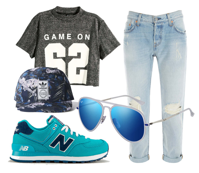 Кепка adidas, топ H&M, джинсы Levi's, очки Ray-Ban, кроссовки New Balance