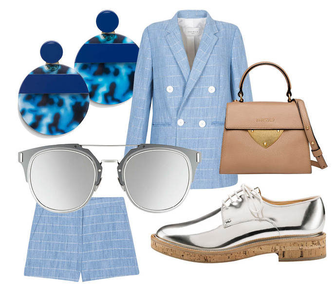 Шорты и пиджак Sandro, сумка Coccinelle, ботинки Christian Louboutin, очки Dior, серьги Emporio Armani