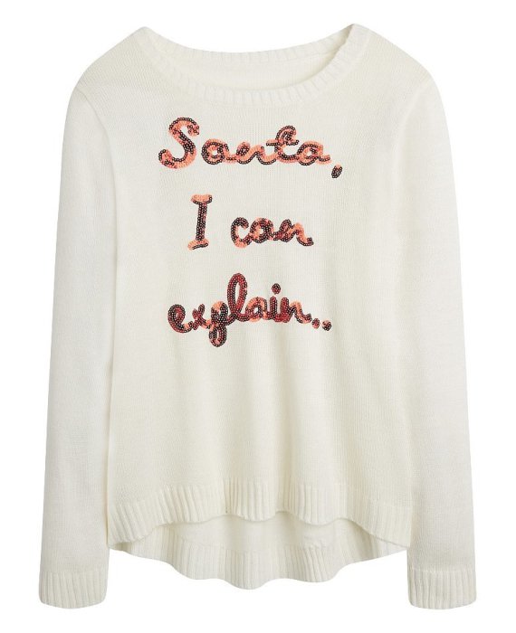На этом белом свитере сияющими пайетками сделана надпись, которая переводится на русский язык так: "Санта, я могу объяснить".