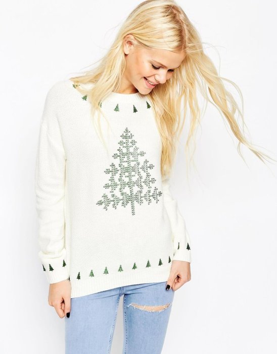Белый свитер "Embroidered Holidays Tree" с декором виде новогодних елочек от известного английского бренда "ASOS" не только согреет в морозы, но и обеспечит праздничное настроение.