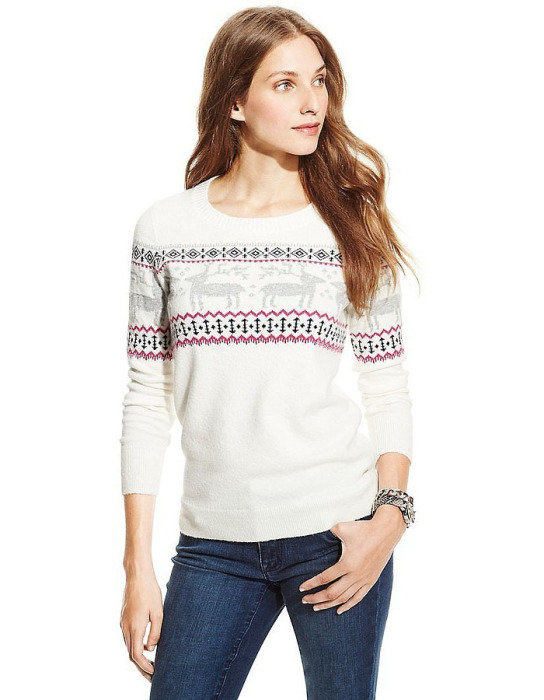 Олени - самое распространенное изображение, встречающееся на зимних вещах. Этот свитер, созданный в технике "Fair Isle" (многоцветное вязание с протяжками по изнаночной стороне полотна) от известного американского бренда "Tommy Hilfiger" смотрится очень празднично, нежно и женственно.
